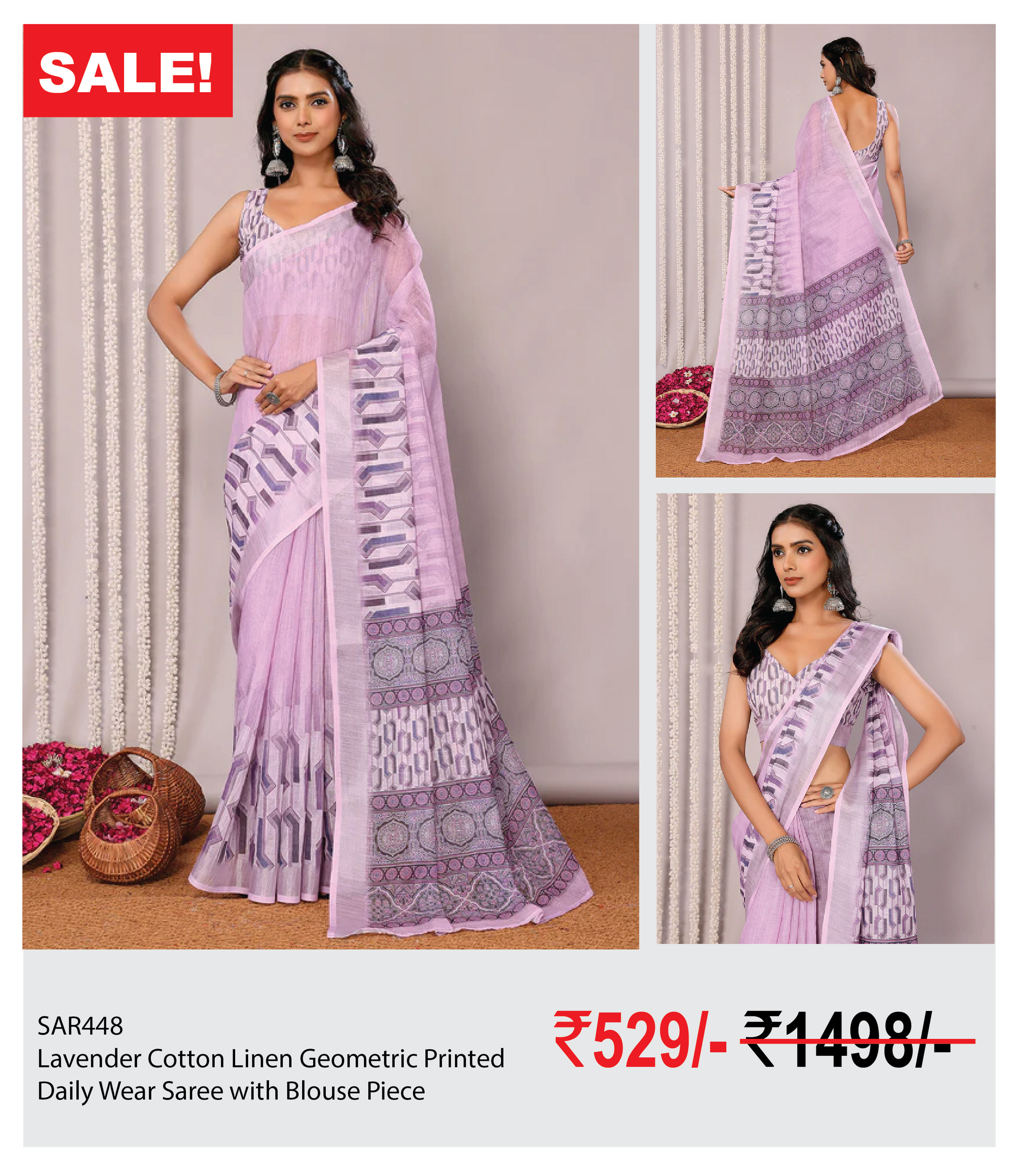 Lavender Cotton Linen Geometric Printed Daily Wear Saree with Blouse Piece