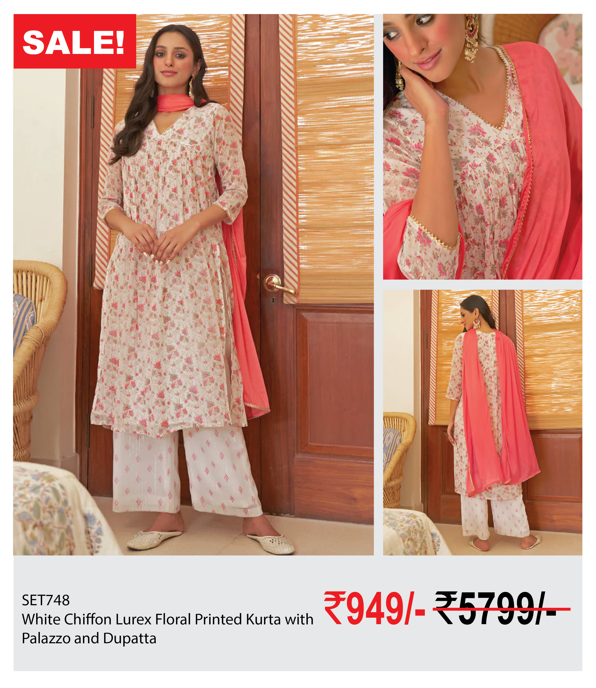 White Chiffon Lurex Floral Printed Kurta with Palazzo and Dupatta